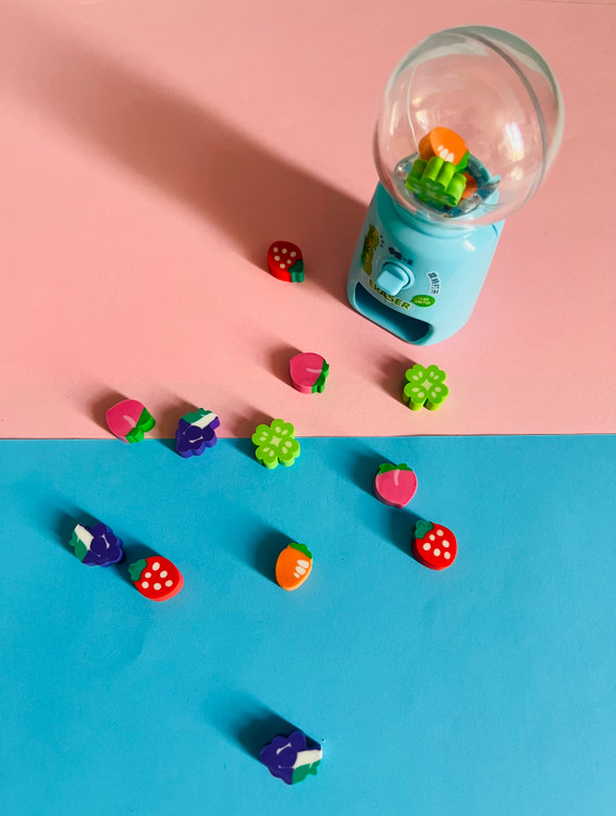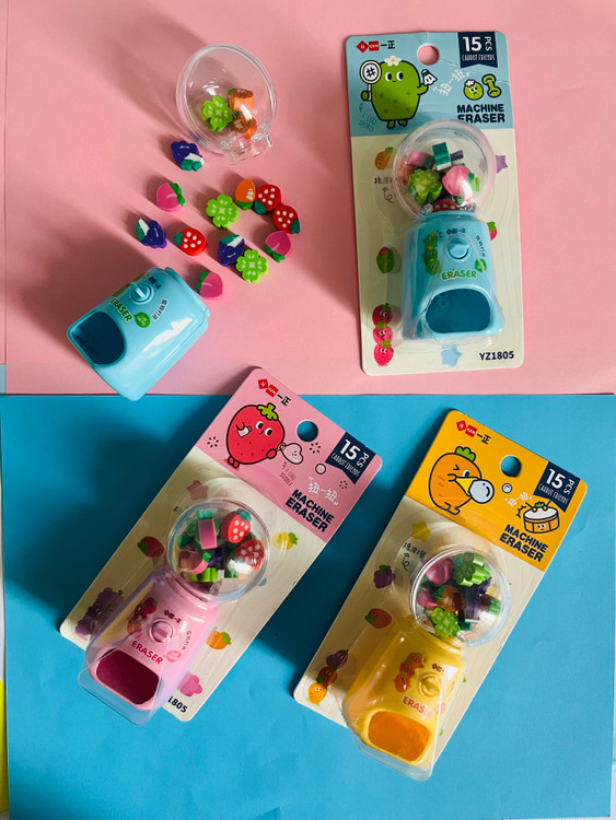 پاکن طرح ماشین آبنباتی یک اسباببازی سرگرمکننده و کاربردی است! ۱۵ عدد پاکن کوچک طرح میوه داخل ماشین قرار دارد و با چرخاندن دکمه، پاکن بهصورت شانسی خارج میشود. این محصول هم سرگرمی است و هم ابزار نوشتاری!