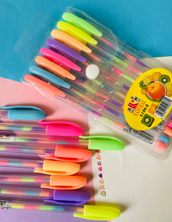 بسته ۸ عددی روانویس فسفری رنگینکمانی با رنگهای شاد و درخشان، انتخابی عالی برای هایلایت کردن، یادداشتبرداری رنگی و نوشتن خلاقانه است. این روانویسها با جوهر فسفری روشن، نکات مهم را برجسته میکنند.