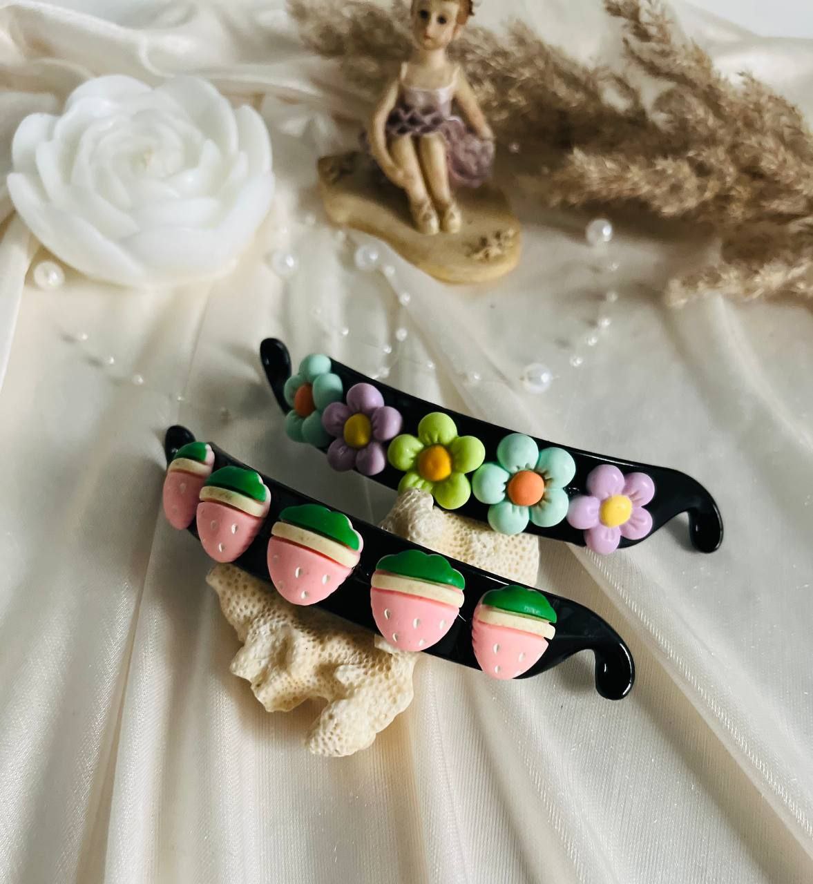 گیره چفتی آبشاری با طرحهای گل و میوه زیبا، انتخابی شیک و کاربردی برای خانمها و دختران است. این گیره با طراحی آبشاری و چفتی محکم، موها را مرتب و زیبا نگه میدارد.
