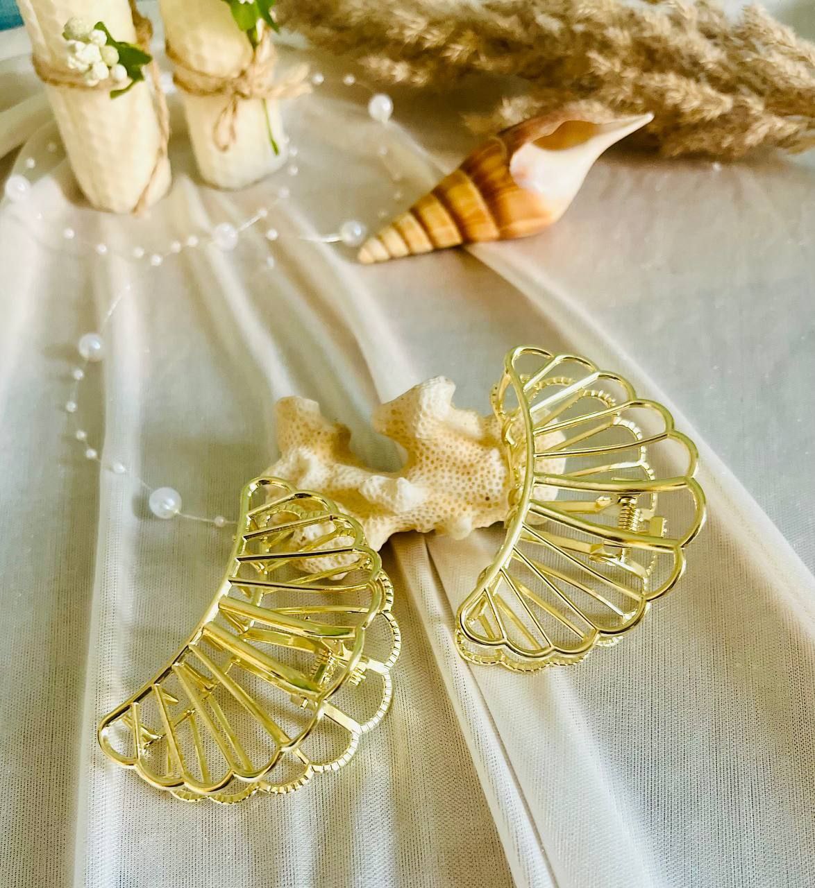 کلیپس صدف طلایی با طراحی شیک و ظریف، انتخابی عالی برای خانمها و دخترانی است که به اکسسوریهای زیبا و مینیمال علاقه دارند. جنس فلزی مقاوم و رنگ طلایی درخشان، جلوهای خاص به موهای شما میدهد.
